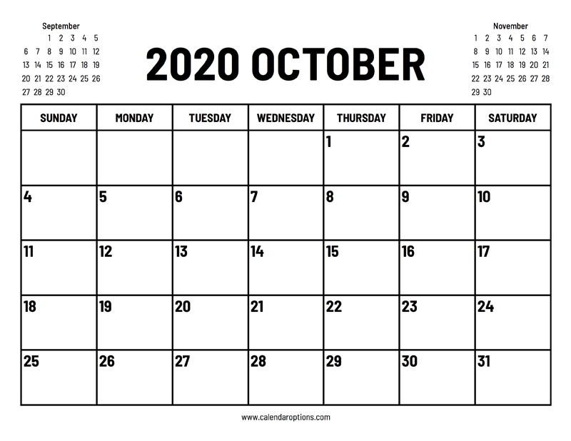This 2020 October calendar is very handy because it has small previews of both the previous and the following month. Paper size: US Letter. Document width and height: 11 x 8.5 inches. Format: PDF.