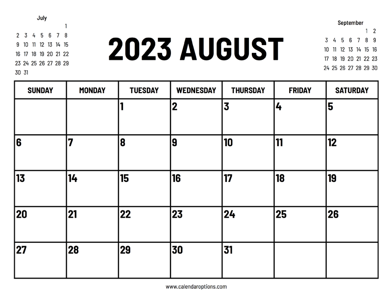 This 2023 August calendar is very handy because it has small previews of both the previous and the following month. Paper size: US Letter. Document width and height: 11 x 8.5 inches. Format: PDF.