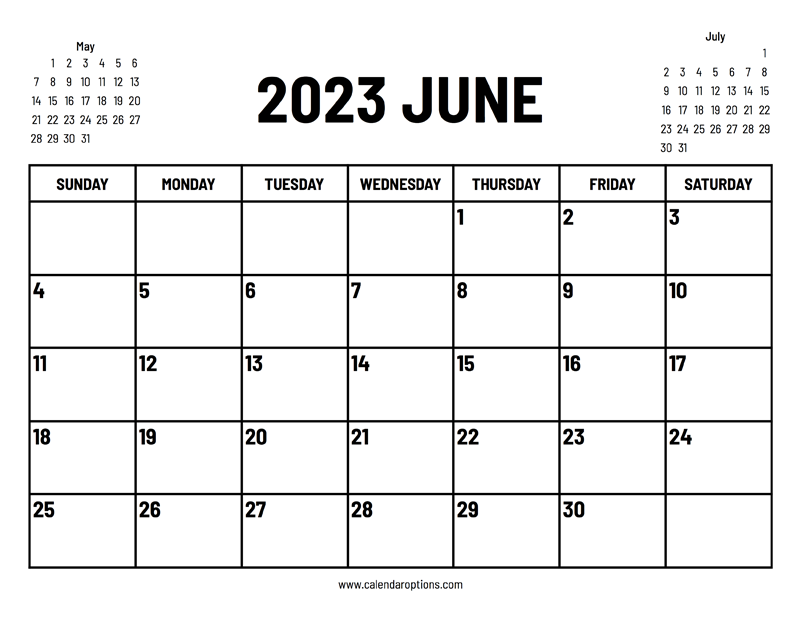 This 2023 June calendar is very handy because it has small previews of both the previous and the following month. Paper size: US Letter. Document width and height: 11 x 8.5 inches. Format: PDF.
