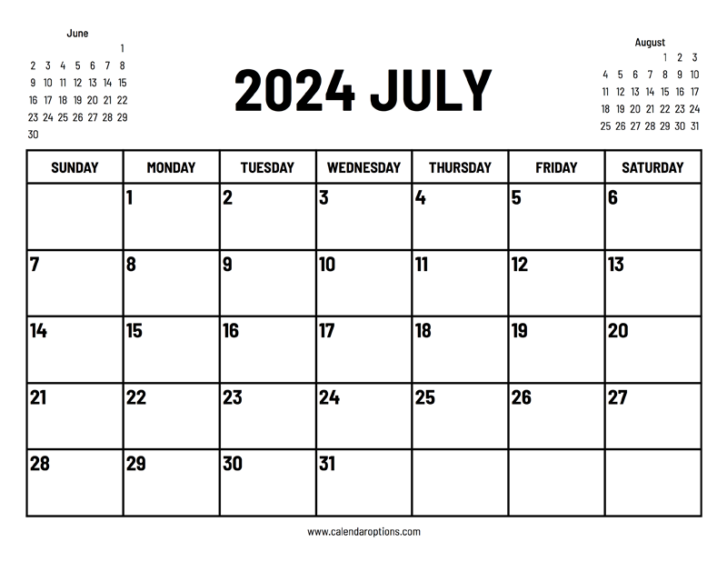 This 2024 July calendar is very handy because it has small previews of both the previous and the following month. Paper size: US Letter. Document width and height: 11 x 8.5 inches. Format: PDF.