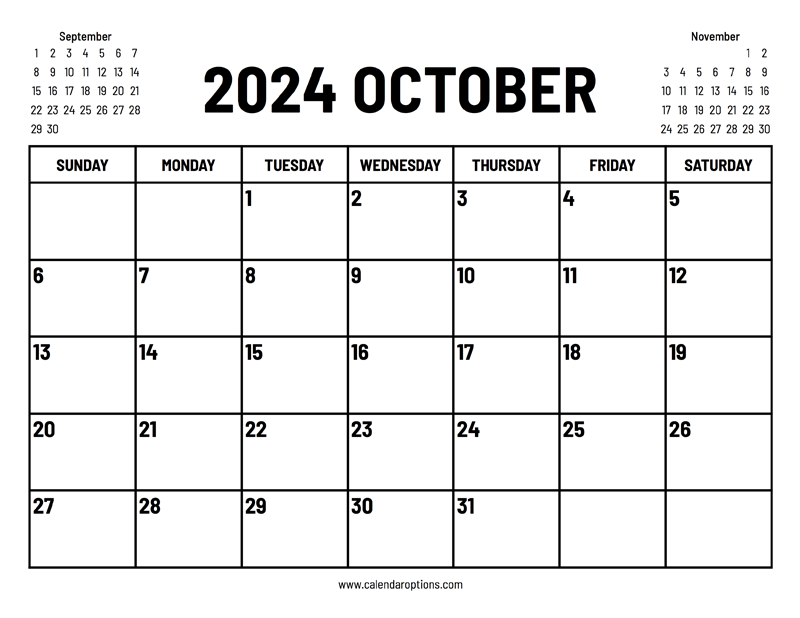 This 2024 October calendar is very handy because it has small previews of both the previous and the following month. Paper size: US Letter. Document width and height: 11 x 8.5 inches. Format: PDF.