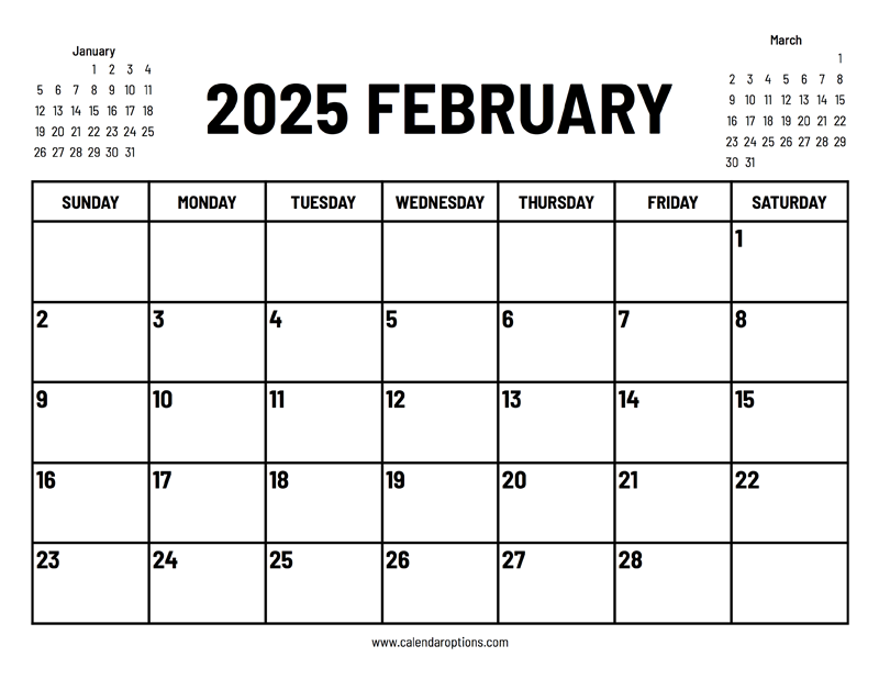 This 2025 February calendar is very handy because it has small previews of both the previous and the following month. Paper size: US Letter. Document width and height: 11 x 8.5 inches. Format: PDF.
