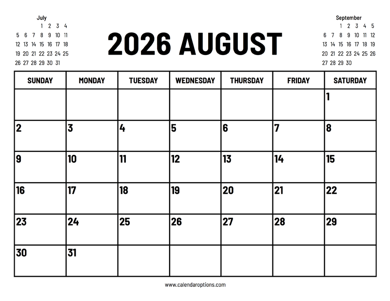 This 2026 August calendar is very handy because it has small previews of both the previous and the following month. Paper size: US Letter. Document width and height: 11 x 8.5 inches. Format: PDF.