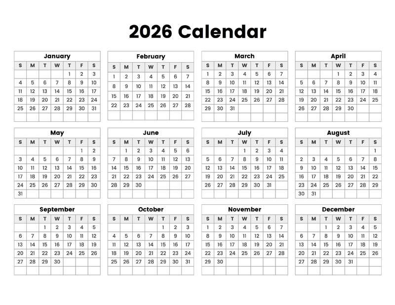 Download this 2026 calendar which makes it easy to have a quick glance at a date and its corresponding day of the week. This simple calendar template comes in a printable PDF format. Paper size: US Letter. Document width and height: 11 by 8.5 inches.