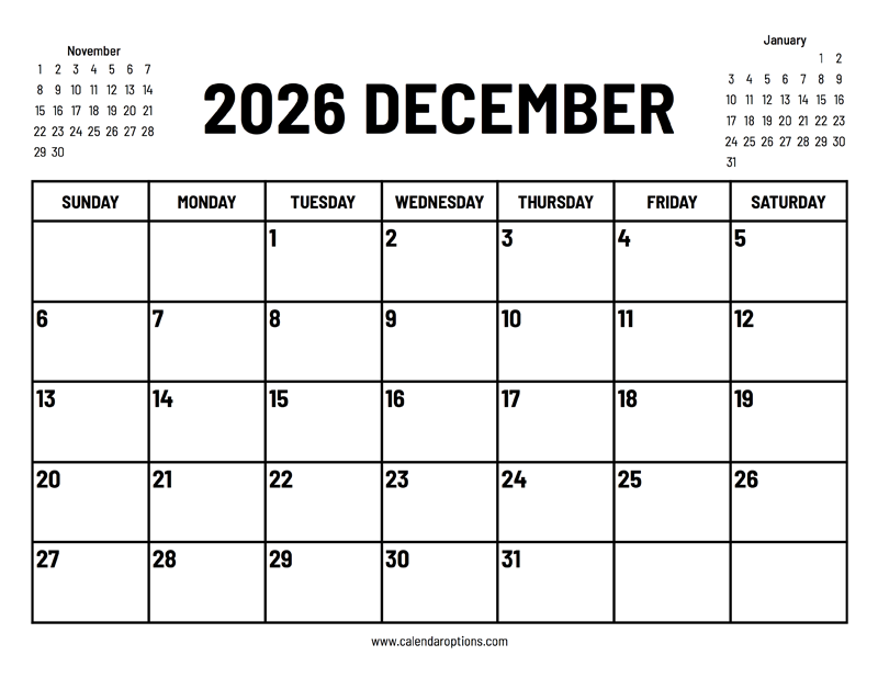 This 2026 December calendar is very handy because it has small previews of both the previous and the following month. Paper size: US Letter. Document width and height: 11 x 8.5 inches. Format: PDF.