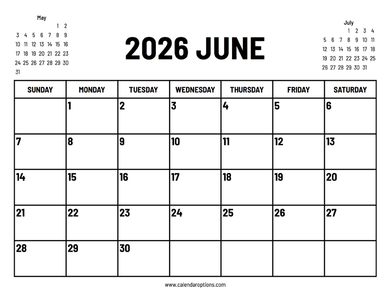 This 2026 June calendar is very handy because it has small previews of both the previous and the following month. Paper size: US Letter. Document width and height: 11 x 8.5 inches. Format: PDF.