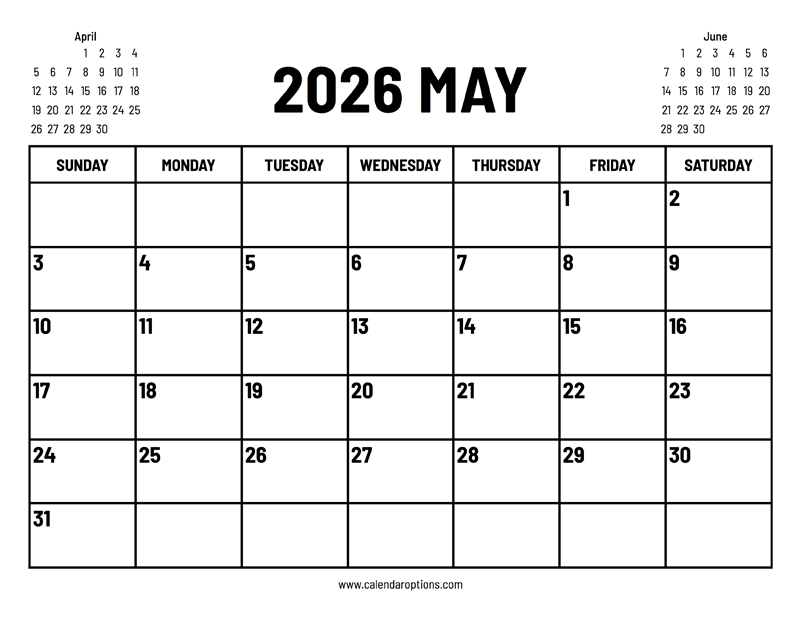 This 2026 May calendar is very handy because it has small previews of both the previous and the following month. Paper size: US Letter. Document width and height: 11 x 8.5 inches. Format: PDF.