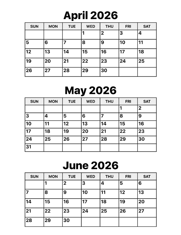 Download this April, May and June 2026 calendar with all the three months on one page. This quarterly calendar is available as a printable PDF and it’s widely used in the financial and business sector for scheduling events in Q2. Paper size: US Letter. Document width and height: 11 x 8.5 inches.