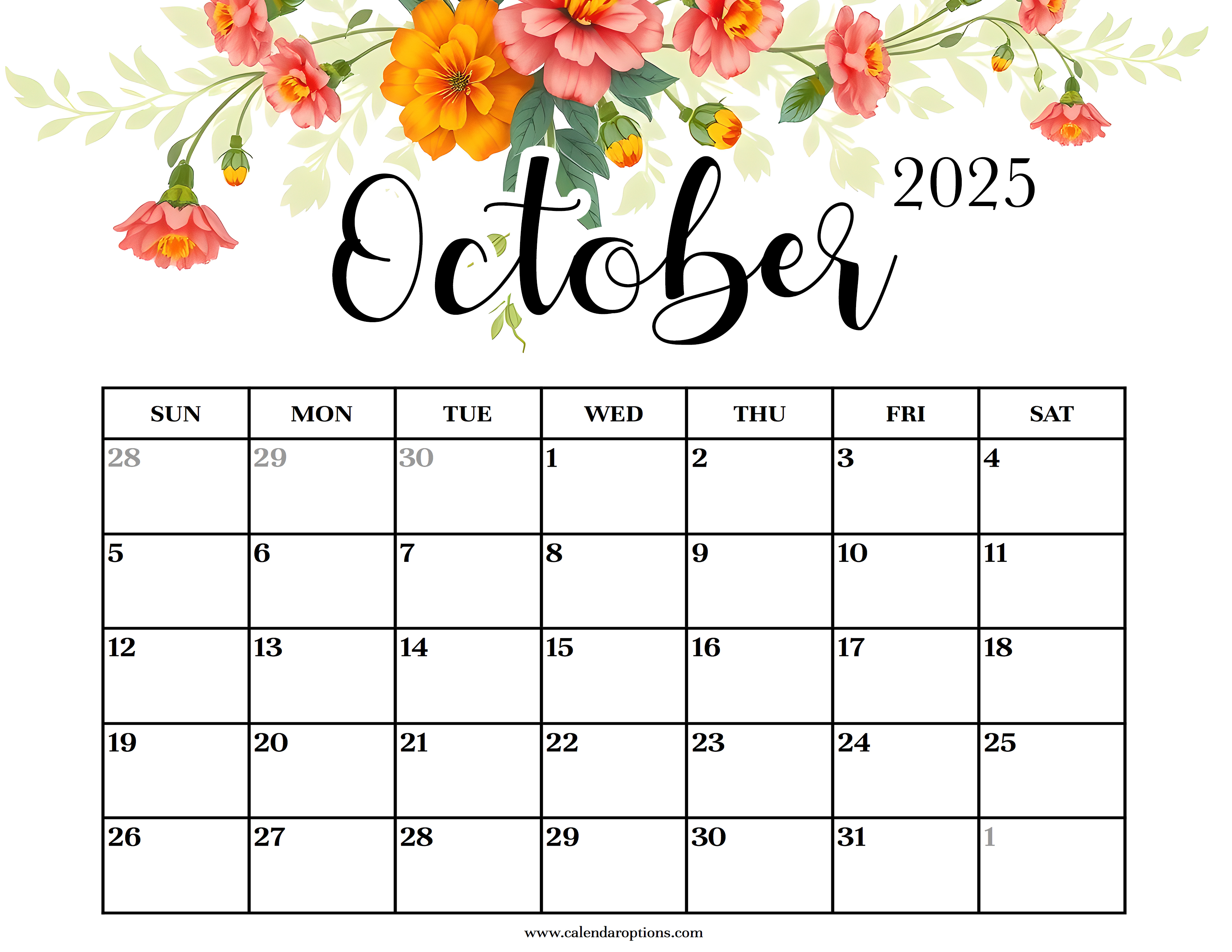 The second October calendar with flowers is an eye-catcher! The watercolor illustration of marigold flowers really ties this calendar template together.