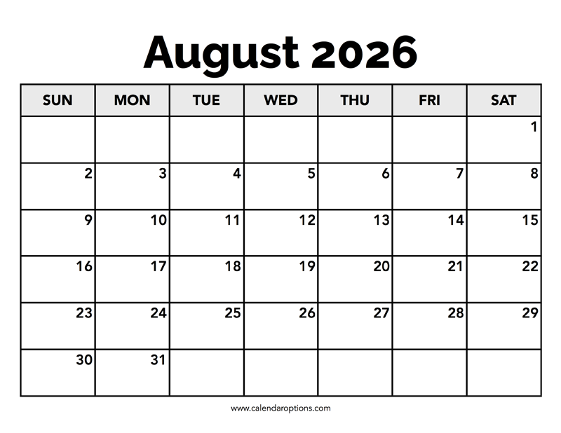 With this blank calendar for August 2026 planning and scheduling events is a joy. Like all the others, the template is free to download as a PDF file. Paper size: US Letter. Document width and height: 11 x 8.5 inches.