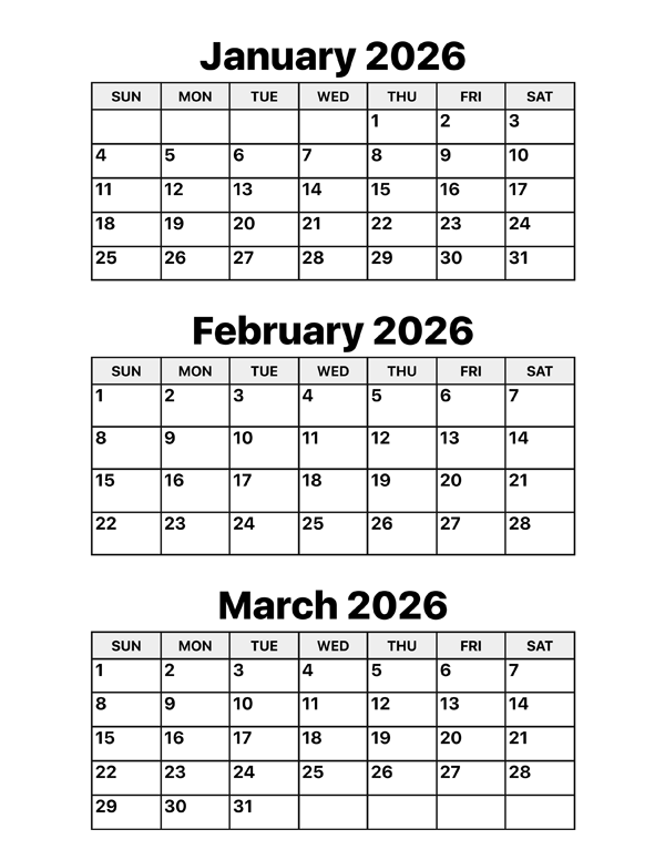 A January, February and March 2026 calendar with all the three months on one page. This quarterly calendar is available as a printable PDF and it’s widely used in the financial and business sector for scheduling events in Q1. Paper size: US Letter. Document dimensions: 8.5 by 11 inches.