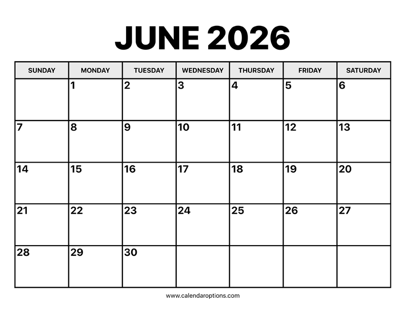 This June calendar for 2026 is free to download by anyone looking for a basic calendar template to use at home or at work. Paper size: US Letter. Document width and height: 11 by 8.5 inches.