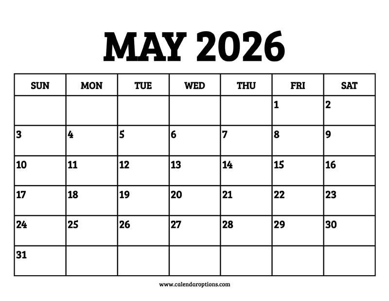 Download this May 2026 calendar printable PDF and start organizing your agenda in a more effective way. Paper size: US Letter. Document dimensions: 8.5 by 11 inches.