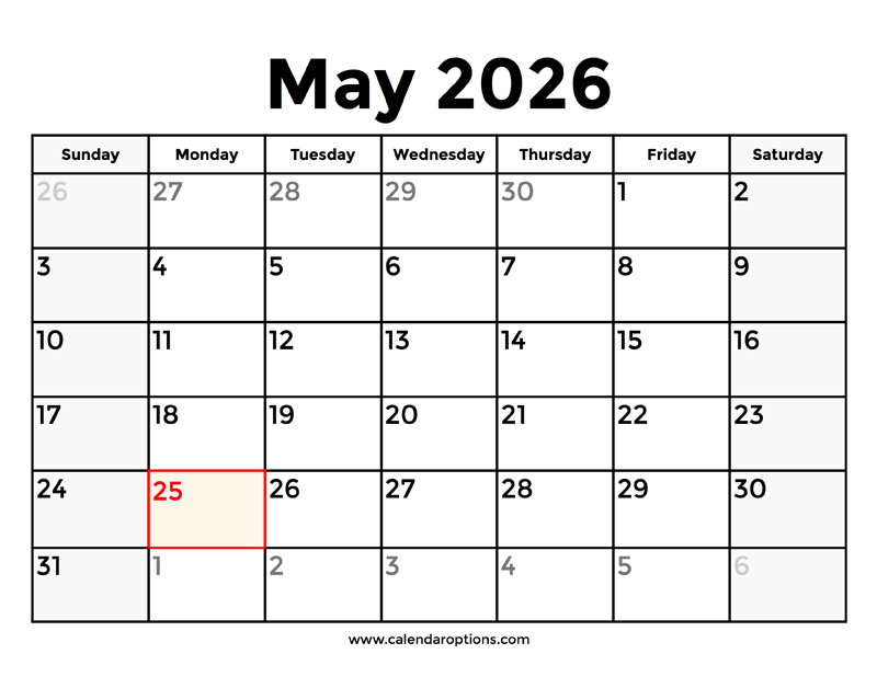 Download this May 2026 calendar with holidays to know in advance when the next long weekend will be. In the United States there is one official holiday in May: Memorial Day, on the 25th. Paper size: US Letter. Document width and height: 11 x 8.5 inches.