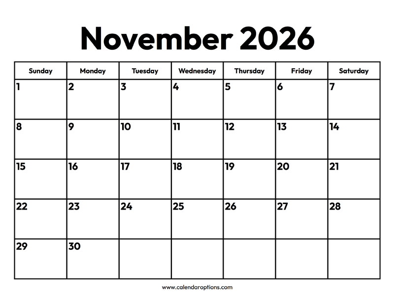 Download this November 2026 calendar and use it for your personal or business needs. This simple calendar is available in a printer friendly PDF format. Paper size: US Letter. Document width and height: 11 x 8.5 inches.