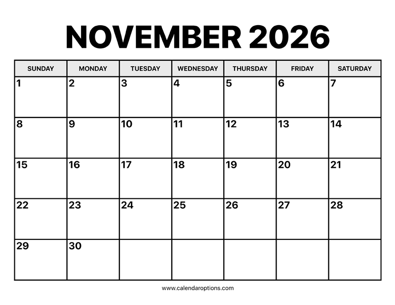 This November calendar for 2026 is free to download by anyone looking for a basic calendar template to use at home or at work. Paper size: US Letter. Document width and height: 11 by 8.5 inches.
