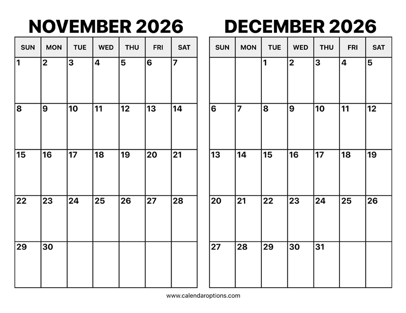 This November and December calendar is available in a printable PDF format and can be downloaded for free. If you’re looking for a 2 month calendar on one page, this one might fit your needs. Paper size: US Letter. Document dimensions: 8.5 by 11 inches.