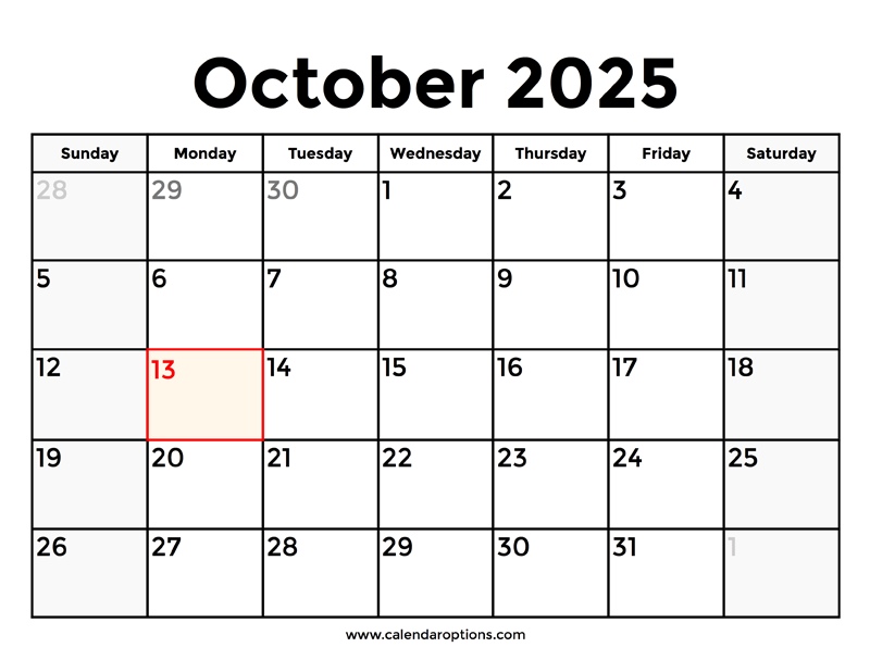 Download this October 2025 calendar with holidays to know in advance when the next long weekend will be. In the United States there is one official holiday in October: Columbus Day, on the 13th. Paper size: US Letter. Document width and height: 11 x 8.5 inches.
