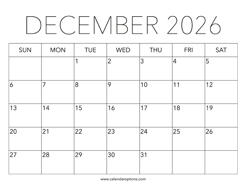 This printable December 2026 calendar was optimized to be eco-friendly by using less printer ink compared to other templates. Paper size: US Letter. Document width and height: 11 by 8.5 inches. Format: PDF.