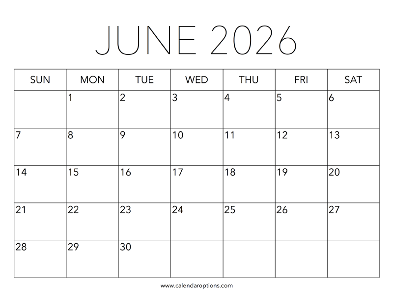 This printable June 2026 calendar was optimized to be eco-friendly by using less printer ink compared to other templates. Paper size: US Letter. Document width and height: 11 by 8.5 inches. Format: PDF.