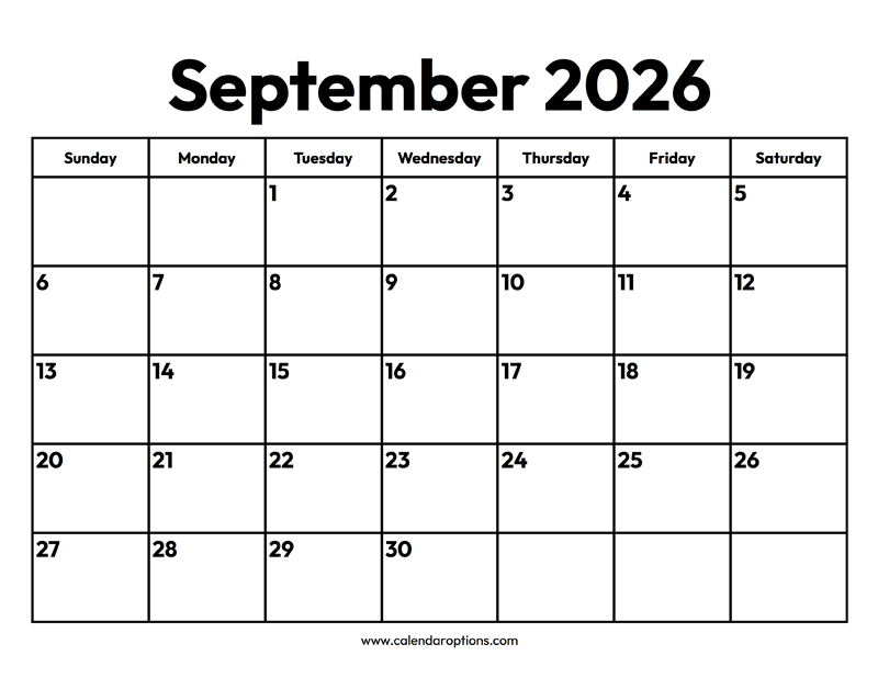 Download this September 2026 calendar and use it for your personal or business needs. This simple calendar is available in a printer friendly PDF format. Paper size: US Letter. Document width and height: 11 x 8.5 inches.