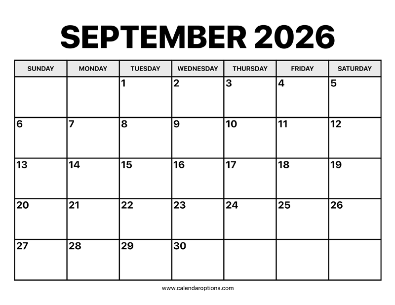 This September calendar for 2026 is free to download by anyone looking for a basic calendar template to use at home or at work. Paper size: US Letter. Document width and height: 11 by 8.5 inches.